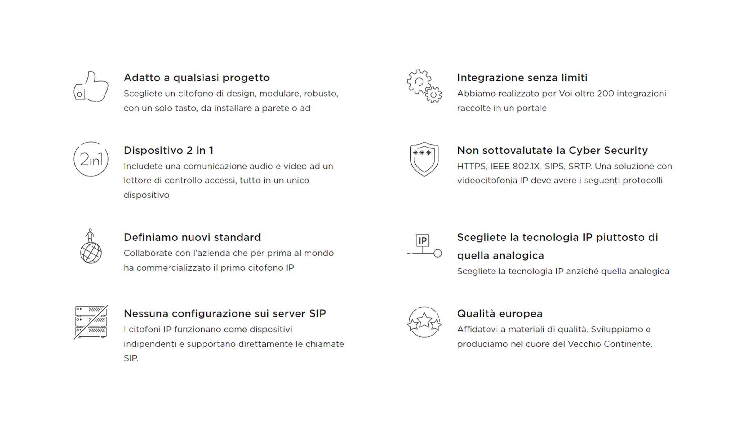 La tecnologia IP sfruttata da Teleline permette l’integrazione con altri sistemi, la possibilità di collegare il citofono ad un telefono o ad uno smartphone per gestire la risposta ed apertura, supporta la tecnologia PoE quindi non necessita di cavi di alimentazione oltre il cavo ETH.
